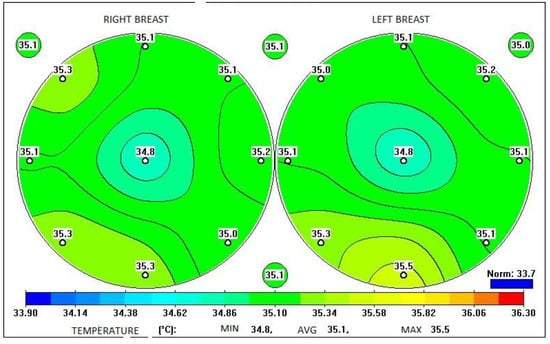 In contrast, the thermograms shown in Figure 2 of a healthy patient do not display any of these features; no areas with elevated temperatures are observed, and temperature fluctuations are within the normal range. Note that not all characteristics of patients at risk of developing breast cancer are described here. For example, patients also commonly have specific areas with elevated temperatures, such as in the nipple area.