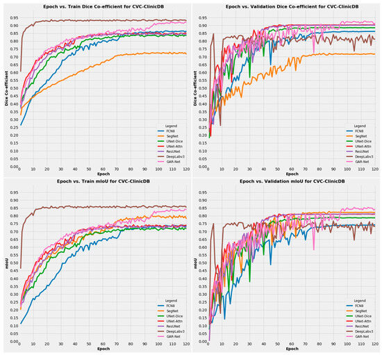 From the plotted graphs, as shown in Figure 6, we can observe that our model performance is consistent in both the training and validation set on the Kvasir-SEG dataset also. Our proposed model shows competitive performance in terms of dice coefficient and outperforms all other models in mIoU in the validation set, thus providing a robust solution.