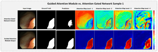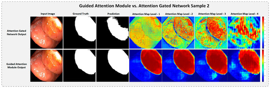To understand the significance of Guided Attention Learning in our GAR-Net architecture, we compared and visualized the attention map from the existing Attention Gated Mechanism [24] and the proposed GAM with GAL by taking a random test sample from both datasets. The attention visualization is presented in Figure 9 and Figure 10 for a random test sample in the CVC-ClinicDB dataset and Kvasir-SEG dataset, respectively.