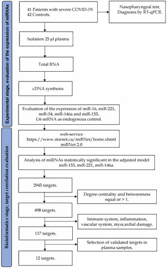 In this context, the use of molecular principles of gene regulation mechanisms could represent an innovative way to identify potential biomarkers of infection for developing antiviral therapeutic agents for certain diseases that do not have yet an effective treatment, such as COVID-19. Despite there are validated and approved methods available for COVID-19 diagnosis, prognosis is still complicated by only assuming the positive results of rapid antigen tests, serological tests, or RT-qPCR. For this reason, we are continuously looking for reproducible methods that are able to predict poor prognosis even at early points after infection. Most COVID-19 studies have focused on proteomic, metabolomic, and cellular biomarkers []. In the last decade, noncoding RNAs (ncRNAs) and miRNAs, have emerged as novel tools to aid in medical decision-making and can be easily measured through standard techniques already employed in clinical laboratories, such as RT-qPCR. miRNAs are sensitive, robust, and cost-effective biomarkers that offer additional information to already established clinical variables and clinical indicators []. They are stable in various body fluids and offer advantages as biomarkers because they are highly conserved between species, and their expression patterns are tissue and life-stage specific. The advantage of miRNAs is their consistent detectability in patients with lower COVID-19 severity and a lesser dependence on sampling time. The integration of miRNAs into biomarker signatures may improve the performance of established biomarkers, as demonstrated for binary and triplet combinations with D-dimer, troponin T, SARS-CoV-2, RNAemia, age, and BMI []. Target genes for these miRNAs play an important role in the immune dysregulation observed in COVID-19 patients, and they may also be evaluated as potential biomarkers in the context of long-COVID, because cumulative evidence suggest immune alterations in patients with persistent symptoms or post-COVID-19 symptoms.