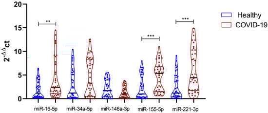 Violin plot shows the relative expression of miRNAs in COVID-19 patient vs. healthy controls. The violins represent medians and interquartile ranges. Data were analyzed using the Kruskal–Wallis test and Dunn’s post hoc test when significant values were obtained (** and *** p ˂ 0.05).