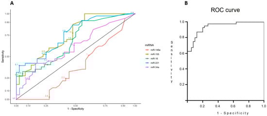 (A) ROC curve with individual miRNAs. (B) ROC curve built with the variables included in the logistic regression model. (AUC: 0.95, 95%CI 0.89–0.98). Nagelkerke pseudo-R2 statistic, ranging from 0 to 1.