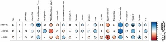 Correlations between significant miRNAs and clinical characteristics. Blue circles represent positive correlations, while red circles represent negative correlations. Significance of correlation is, accordingly, the circle diameter. Spearman’s correlation (* p < 0.05).