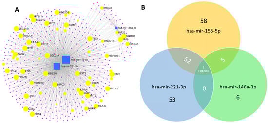 miRNA-target gene network related to immune system. (A) Results of pathway and network analyses for the 3 miRNAs, selected according to the logistic regression model. Blue squares indicate miRNAs, pink dots indicate corresponding targets, and yellow circles represent genes involved in immune system functions that can be targeted by two or more of the selected miRNAs. (B) Venn diagram shows the miRNAs 155-5p, 146a-3p, and 221-3p and the number of their immune system targets. CDKN1B gene is shared between miRNAs.
