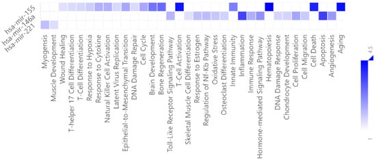 Finally, in the functional association analysis (Figure 6), miRNAs statistically different in COVID-19 patients showed enriched functional terms, including aging, apoptosis, T-cell differentiation, hematopoiesis, and immune response, among others.