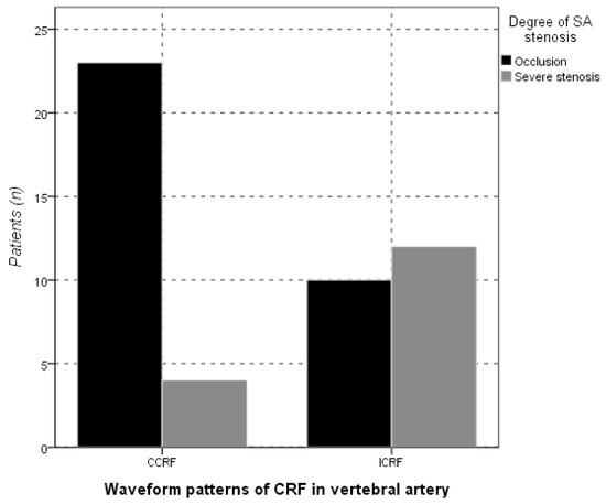 Comparison of subtypes of the completely reversed flow (CRF) waveform in vertebral artery (VA) and severe stenosis or occlusion of the subclavian artery (SA). SA occlusion was associated with continuous CRF (CCRF), and intermit CRF (ICRF) was involved with severe SA stenosis (p = 0.005). CRF, completely reversed flow; VA, vertebral artery; SA, subclavian artery; CCRF, continuous CRF; ICRF, intermittent CRF.
