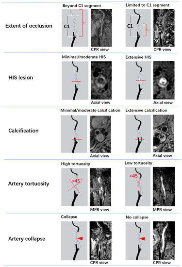 Images were imported to a workstation (AW4.6; GE Healthcare) for review by two radiologists (J.Z. and H.Z., with 4 and 10 years of experience, respectively) blinded to clinical information. In cases of disagreement, a third reviewer (J.X., with 20 years of experience) was consulted to reach a consensus. Multi-planar reconstruction (MPR) reformats were generated as necessary during the image review. The following lesion characteristics were evaluated: (a) the extent of the occlusion, which was classified using MERGE as being limited to or beyond the cervical (C1) segment; (b) proximal stump morphology, which was classified using 3D MERGE as tapered, blunt, or absent [18]; (c) hyperintense signals (HIS), representing an intraplaque hemorrhage or fresh thrombus [21,22,23], which was determined on 3D SNAP in the occluded C1 segment and classified as minimal/moderate (<50% of the total vessel area at any cross-section) or extensive (≥50%); (d) calcification, which was identified as hypointense signals on both 3D MERGE and 3D SNAP [20,24] in the occluded C1 segment and classified as minimal/moderate or extensive, similar to HIS; (e) high tortuosity, which was defined as having at least 1 bend of >45° on the MPR view of the 3D MERGE images in the occluded C1 segment [25]; (f) artery collapse, representing severe negative remodeling, which was defined if the total vessel area had a diameter of <50% of that of the contralateral ICA at the same level. Figure 1 illustrates the above MR-VWI characteristics of CICAO.