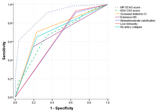 Receiver-operating characteristic (ROC) curves of the MR CICAO score, the DSA CAO score and each single MR-VWI characteristic used to predict successful endovascular recanalization. Area under curve (AUC) of the MR CICAO score = 0.888 (95%CI: 0.816–0.960; p < 0.001), cut-off value: 3.5, and AUC of the DSA CAO score = 0.682 (95%CI: 0.559–0.804; p = 0.008), cut-off value: 3.5.