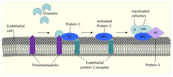 PC and PS are members of the vitamin K-dependent glycoprotein family. Thrombin activates PC to become activated protein C (APC), and once APC is formed, it binds to PS, a non-enzymatic cofactor, on the surface of activated cells. This combination will then inactivate factors Va and VIIIa by restricting proteolysis. APC will inhibit thrombin generation by deactivating the active clotting factors Va and VIIIa (Figure 2). Sixty percent of PS is attached to the C4b-binding protein, while 40% circulates as free PS [56], and only free PS is functionally active [57]. Inherited PC, PS, and AT deficiencies have been associated with a higher risk of recurrent thrombosis.