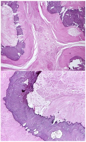 Operative findings and pathological examination confirmed a severely calcified uterine leiomyoma. The mass was well demarcated and composed of multiple nodules of collagen-rich smooth muscle tissue, which contained frequent central islands or irregular ring-like bands of calcifications. The smooth muscle cells were arranged in interlacing fascicles and showed bland and uniform nuclei, without atypia or increased mitotic activity. Microscopic pathology: (A) Collagen-rich nodules of smooth muscle tissue containing calcifications in the central zone. (B) Interlacing fascicles of smooth muscle cells without nuclear atypia adjacent to the calcification band.
