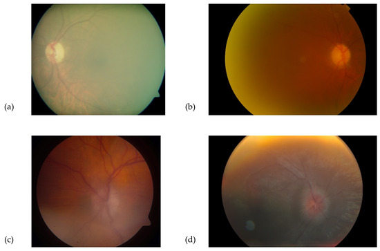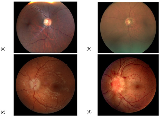 Figure 1. Examples of “good” quality colour fundus photographs of normal optic discs and discs with papilledema, acquired with handheld cameras (a,b) and desktop cameras (c,d).