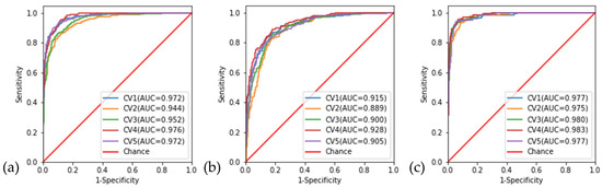 Receiver operating characteristic curves (ROC) and areas under the curves (AUC) of individual folds for the 5-fold cross-validation performed on the testing dataset. (a) “good” quality versus (“borderline” and “poor” quality) images; (b) “borderline” quality versus (“good” and “poor” quality) images and (c) “poor” quality versus (“good” and “borderline” quality) images.