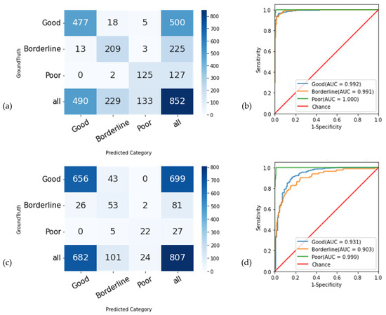 The performance of the DLS was evaluated using the one-versus-rest strategy by various performance metrics which included the area under the receiver operating characteristic curve (AUC), accuracy, sensitivity, and specificity according to our classification model (one vs. rest approach): “good” quality vs. (“borderline” and “poor”) quality, “borderline” quality vs. (“good” and “poor”) quality, and “poor” vs. (“good” and “borderline”) quality images. The overall accuracy was used to measure the performance of the model.
