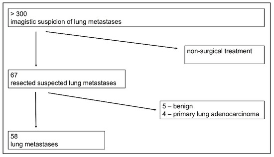 Fifty-eight patients were included in our study and retrospectively analyzed, based on the pathological result of resected pulmonary metastasis, completeness of clinical data, and presence of follow-up. Exclusion criteria were the pathological report showing either a benign result of the resected pulmonary lesion or a primary pulmonary malignant histology (another cancer besides the known one), non-surgical treatment of the pulmonary metastases.