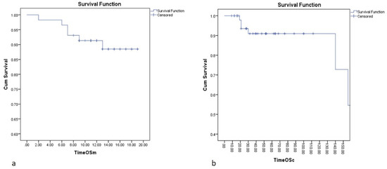 Regarding the type of resection, in COX regression analysis typical resection (lobectomy) was associated with higher risk of death of HR = 1.831, 95% CI, 0.334–10.031, p = 0.486, comparing to wedge resection (non-anatomical lung resections); the result is lacking statistical significance. Median survival was not reached. The estimated mean survival in patients with typical (anatomical) lung resection vs. wedge (non-anatomical) was 16.5 months vs. 17.96 months (Figure 3b).