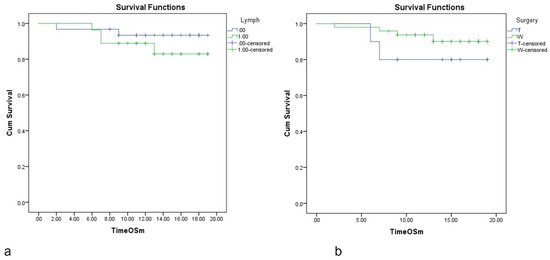 Survival analysis according to lymphadenectomy shows no statistical difference between lymphadenectomy and without lymphadenectomy—the 12 months OS was 88% for lymphadenectomy vs. 94% for patients without lymphadenectomy (Figure 3a).