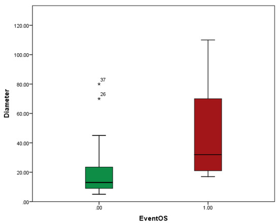 There was a statistical difference between the mean diameters of the largest metastasis excised in patients in which the event happened (death) or patients still alive (47 mm vs. 18 mm, p = 0.001) (Figure 4), emphasizing the importance of the accurate selection of patients and early referral to thoracic surgery. There was no difference in the mean number of metastases excised in dead or alive patients (p = ns).
