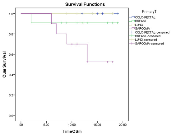 Regarding the overall survival of different primary tumors after metastasectomy, the worst outcome was noticed in patients with sarcoma, and no death was yet reported in patients with colorectal and lung cancer. The COX regression analysis showed a statistically significant worst outcome for sarcoma p = 0.04 with an increase of risk of death of 3.4 times for patients with sarcoma compared to other sites. (HR = 3.45, 95%CI 1.056–11.286) (Figure 6). Longer follow-up is needed.
