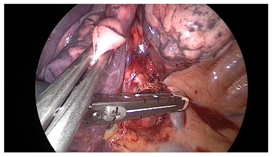 The lobectomy might be indicated in central or multiple lesions occupying the same lobe. Pneumonectomy should be avoided because it massively impairs respiratory functions and should be performed only in highly selected patients undergoing multidisciplinary team management [1,5]. In our study, we did not perform pneumonectomy for lung metastases. Lobectomy (Figure 8) or segmentectomy was performed in 11 patients—from which in two cases wedge pulmonary resections were added, and in another two cases other anatomical structures were removed (atrial and pericardial resection in one case, and parietal pleura in another case).