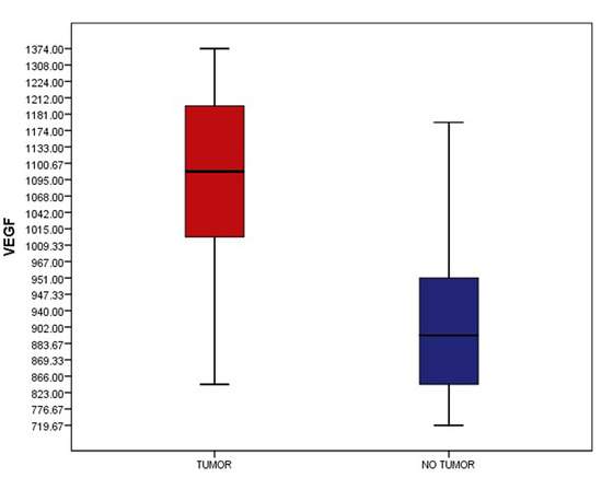 VEGF values were statistically different in patients with a residual macroscopic tumor compared with patients without any residual tumor. Thus, in the group of patients with residual tumors, the median value was 1070 pg/mL, and in the group of patients without tumors, their mean value was 897 pg/mL. There was a statistically significant difference between the two categories of values, p = 0.0001, as shown in Figure 1.
