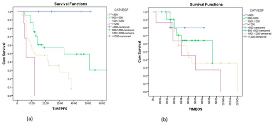 Kaplan–Meier curves estimating disease-free survival (a) and overall survival (b) according to VEGF categories (less than 800 pg/mL, 800–1000 pg/mL, 1001–1200 pg/mL, more than 1200 pg/mL) in patients with ovarian cancer.
