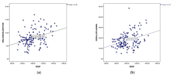 Positive correlation between VEGF and malondialdehyde (a) and VEGF and ceruloplasmin (b).