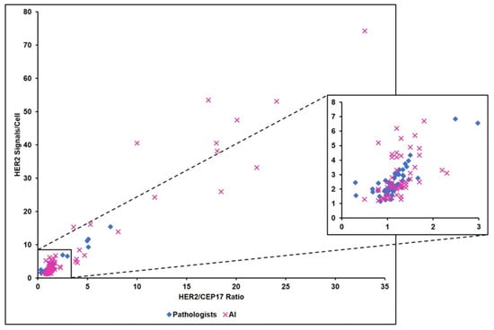 - Ellis, C.M.; Dyson, M.J.; Stephenson, T.J.; Maltby, E.L. HER2 amplification status in breast cancer: A comparison between immunohistochemical staining and fluorescence in situ hybridisation using manual and automated quantitative image analysis scoring techniques. J. Clin. Pathol. 2005, 58, 710–714. [Google Scholar] [CrossRef] [PubMed]