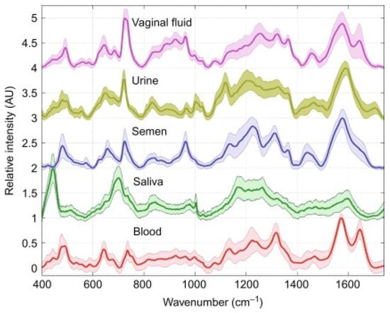 Recognizing and differentiating biofluids in forensics is increasingly crucial and decisive in the development of an investigation. As reported by W. R. Premasir, SERS spectra of 24 h dried samples of human blood, vaginal fluid, semen, saliva, and urine could provide good quality and reproducible characteristic SERS signatures leading to rapid identification of body fluids (Figure 1) [].
