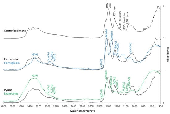 Mean normalized infrared (IR) spectra of urinary sediment of control subjects, patients with hematuria, and patients with pyuria. Distinctive peaks were present at 1592 cm−1 (urea), 1457 cm−1, (urea), 1334 cm−1 (creatinine), 1237 cm−1 (creatinine), and 1154 cm−1 (urea). The amide I (1655 cm−1 and amide II (1525 cm−1) bands were overlapping in the region from 1510 to 1750 cm−1. A dried suspension of hemoglobin (blue line) and isolated leukocytes (green line) was added to the figure. Typical molecular assignments of a biological IR spectrum were indicated on the IR spectra of hemoglobin and the leukocytes: V = stretching vibrations; δ = bending vibrations; s = symmetrical vibrations and as = asymmetrical vibrations. Picture reproduced with permission from “Exploring the possibilities of infrared spectroscopy for urine sediment examination and detection of pathogenic bacteria in urinary tract infections.” Steenbeke, M. et al., Clinical Chemistry and Laboratory Medicine [].