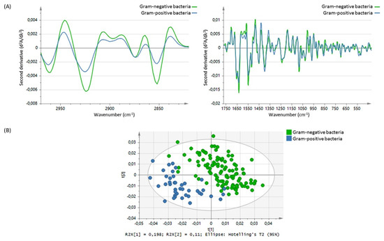 (A) Mean spectral differences in the second derivative from 2970 to 2820 cm−1 and from 1772 to 420 cm−1 between Gram-negative bacteria (green line) and Gram-positive bacteria (n = 41, blue line). (B) Score plot showing clustering of the Gram-negative bacteria (green dots) and Gram-positive bacteria (blue dots), based on principal component analysis in the 2970–2820 cm−1 and 1772–420 cm−1 spectral range. Picture reproduced with permission from “Exploring the possibilities of infrared spectroscopy for urine sediment examination and detection of pathogenic bacteria in urinary tract infections. Steenbeke, M. et al., Clinical Chemistry and Laboratory Medicine [].
