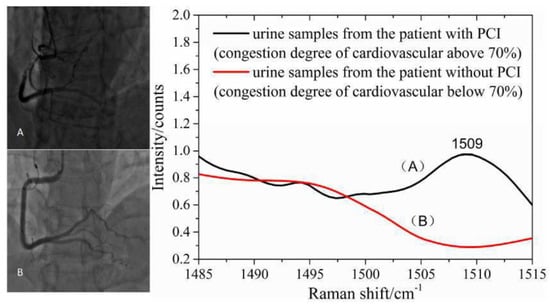 A good example of the use of spectrometric biomarkers applied to the evaluation of a disease and its evolution is the association made by Yang et al. in 2018 between the wavelength of 1509 cm−1 and the presence of coronary occlusion greater than 70%. Trying to correctly classify cardiovascular patients operated on with percutaneous coronary intervention, unoperated, and healthy through the SERS analysis of urine, this wavelength allowed a sensitivity and specificity of 90% and 78.9%, respectively. A possible explanation, whose reasoning links from the spectrometric results back to the biochemical counterpart, was identified in the platelet-derived growth factor-BB (PDGF-BB), a molecule known to be associated with ischemic heart disease. The subsequent spiked urine experiment of this PDGF-BB showed that this substance was precisely associated with this spectrum variation. Moreover, the measured SERS spectra of all urine samples from 87 patients with coronary heart disease were compared with the clinical data provided by the hospital, and they revealed that the appearance of 1509 cm−1 in SERS spectra was in good agreement with the results of coronary angiography technology where cardiovascular congestion was above 70% (Figure 4). In this subgroup classification, sensitivity and specificity were 87.9% and 87.0%, respectively [].
