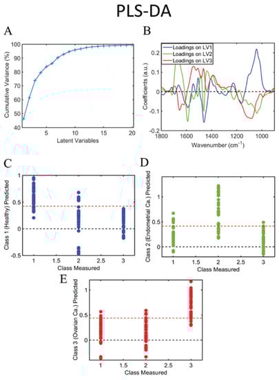 Cumulative explained variance using PCA (A); PCA loadings on PC1, 2 and 3 (B); predicted probability of healthy class versus endometrial and ovarian cancer (C); predicted probability of endometrial cancer class versus healthy and ovarian cancer (D); predicted probability of ovarian cancer class versus healthy and endometrial cancer (E). Class measured 1 = healthy control; 2 = endometrial cancer; 3 = ovarian cancer. PC: principal component. Picture reproduced with permission from “Potential of mid-infrared spectroscopy as a noninvasive diagnostic test in urine for endometrial or ovarian cancer”, Analyst, Paraskevaidi M. et al. 2018 [].
