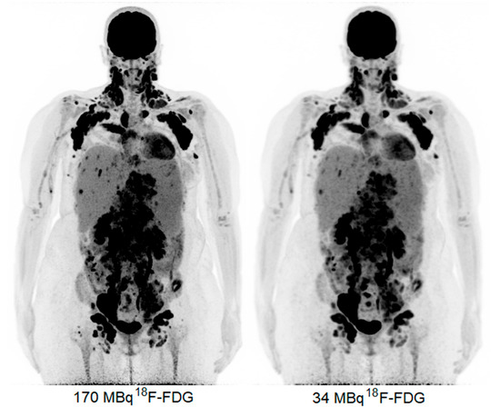 Maximum intensity projection PET images acquired with 170 MBq (left) and 34 MBq (right).