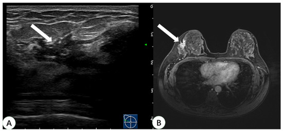 A 44-year-old woman with dense breast tissue underwent virtual navigation: (A) Real-time US with virtual navigation revealed the corresponding lesion (arrow) in the right breast at the 10-o’clock position 5 cm from the nipple, which underwent ultrasound-guided biopsy; (B) CE-MRI showed a non-mass enhanced lesion (arrow) in the upper outer right breast, undetected on second-look US. Pathology obtained by ultrasound-guided biopsy with virtual navigation demonstrated sclerosing adenopathy with intraductal papilloma formation. US = ultrasound; CE-MRI = contrast-enhanced magnetic resonance imaging.