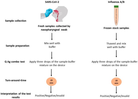 Diagram depicting the test using Q Ag combo. Samples were obtained from participants by nasopharyngeal swab (SARS-CoV-2), or frozen stock (Influenza A/B). Afterwards, the obtained samples were mixed with buffer and about three drops of the mixture were applied to the device. The result can be read and interpreted after 15 min.