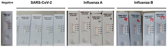 We also compared the performance of the Q Ag combo test with that of pre-existing rapid antigen test kits for the detection of either SARS-CoV-2, influenza A, or influenza B. The Q Ag combo test demonstrated a strong agreement with the Panbio COVID-19 Ag rapid test kit when used to detect SARS-CoV-2. According to the manufacturer, the sensitivity level of the Panbio COVID-19 Ag rapid test kit is 98.1% and the specificity is 99.8% []. The strong agreement between the Q Ag combo test and the Panbio COVID-19 test suggests that the ability of the Q Ag combo test to detect SARS-CoV-2 in the samples is as good as that of the Panbio COVID-19 Ag rapid test kit. When used to detect influenza viruses, the Q Ag combo test demonstrated a strong agreement with the SD Bioline Influenza Ultra Rapid test kit for the detection of influenza A but showed a low level of agreement for the detection of influenza B. We found that among the 68 samples that had previously tested positive for influenza B by RT-PCR, only 14 samples were confirmed to be positive when re-assessed using the SD Bioline Influenza Ultra Rapid test kit. In contrast, when those 68 RT-PCR-confirmed samples were re-assessed using the Q Ag combo test, 62 samples were verified to be positive for influenza B.