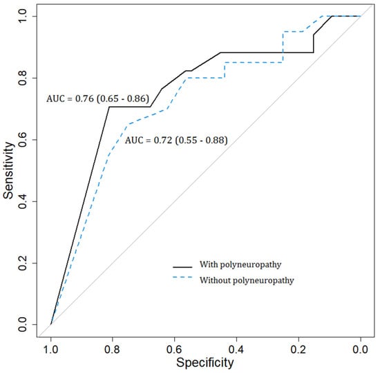 A multiple logistic regression model was performed with CTS as the dependent variable and the BCTQ scale and polyneuropathy (yes vs. no) as independent variables. Model fit was checked through the Hosmer–Lemeshow test, and multicollinearity was checked through the variance inflation factor. The assumption of log-linearity for the quantitative variable was checked through a general additive model using a spline function. The results were presented through the odds ratio with associated confidence interval and statistical significance value. Receiver operating characteristic curves were made to assess the diagnostic value for different variables in classifying the presence of CTS. We calculated the area under the curve (AUC) with the associated confidence interval for each such curve using a bootstrapping method.