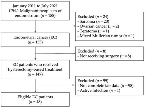 This retrospective study comprised 48 patients diagnosed with EC who underwent hysterectomy-based surgical treatment at our hospital between January 2011 and June 2021. Patients without full laboratory data, including complete blood count and differential count within two weeks before surgery, were excluded. Patients with active infections, autoimmune diseases, or hematological diseases were excluded from this study. EC diagnosis was confirmed by a pathologist.