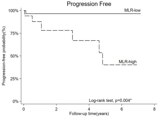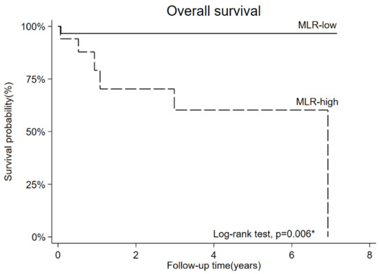 OS and PFS were evaluated using the Kaplan–Meier method, stratified by the MLR cutoff value (Figure 5 and Figure 6). A higher MLR was associated with a significantly worse OS (p = 0.006) and PFS (p = 0.004) than a lower MLR. The 5-year OS rates of MLR-low and MLR-high groups were 96% and 60%, respectively. The 5-year PFS rates of MLR-low and MLR-high groups were 96% and 41%, respectively.