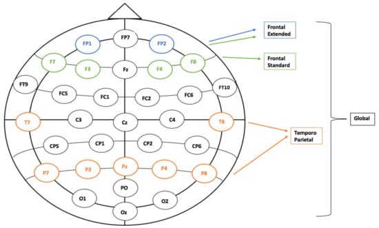 Four different regions of interest (ROIs) were created per the brain areas assessed by cognitive tasks (Global—comprising all electrodes, Frontal Standard—4 electrodes, Frontal Extended—expanding the previous group to the two frontopolar electrodes, Temporo-Parietal—7 electrodes, of which P7 and P8 are considered an equivalent of T5, respectively T6) (Figure 1).