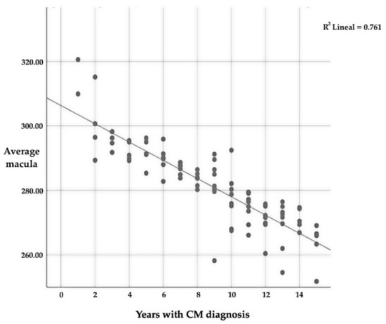 The mean macular thickness is intensely related (p ≤ 0.01) to the number of years since CM diagnosis, with a very strong negative correlation (r = −0.873); this implies that the longer one suffers from CM, the lower the average thickness of the macular (Table 10 and Figure 4). As for the relationship between the different quadrants, there is also a significant relationship (p ≤ 0.01) between all of them and the number of years that a patient suffers with CM.