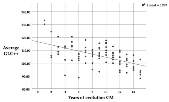 Correlation between GCL++ and the number of years since CM diagnosis.