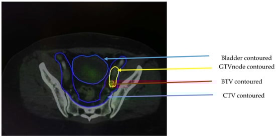 For cervical cancer, the gold standard imaging procedure for treatment planning is the MRI. Although findings from FDG-PET/CT are not part of clinical FIGO staging, various practice guidelines, including the NCCN and the EANM/SNMMI Practice Guideline for Cervical Cancer, recommended adding 18FDG PET/CT to the traditional FIGO/TNM staging in baseline assessment and treatment planning, particularly in locally advanced cervical cancer [33,34]. The NCCN 2022 guideline recommended PET/CT for evaluation of stage IB2 or greater disease, especially for evaluation of nodal or extra pelvic tumour, and for post-treatment surveillance (3–6 months post treatment) [33]. The EANM/SNMMI guideline based its recommendation on results from studies demonstrating that 18FDG PET/CT is more accurate than pure anatomical imaging in detecting both pelvic and para-aortic nodal metastases in cervical cancer, as well as detecting occult supraclavilar lymph node involvement, and like in other tumour types, 18FDG PET/CT-based target volume delineation reduces the inter-observer variability in radiotherapy treatment planning [34]. The use of 18FDG-PET/CT for targeted volume delineation and identifying nodal metastasis has been reported in many studies [7,35,36,37]. Tsai et al., in 2004., reported that PET/CT detected additional para-aortic metastases in nearly 30% of patients following baseline CT and MRI [38]. In a systematic review of the literature searching for the evidence for the use of PET for radiation treatment planning in patients with cervical cancer, Salem et al., in 2011, showed that the most accurate imaging technique for identifying nodal metastases in cervical cancer patients was PET-CT [39]. This was shown to impact external-beam radiotherapy planning by modifying the treatment field and customising the radiation dose, particularly in patients with previously undetected para-aortic and inguinal nodal metastases [39]. In a more recent review by Zhou et al. in 2018, 57% of the treatment was modified following a PET/CT examination [40]. Generally, the prominent role of PET/CT treatment planning in cancer of the cervix is in cases of para-aortic lymph node involvement, enlarged pelvic nodes, uterine canal involvement, high tumour grade, and locally advanced disease [35]. See Figure 2 below, in which is shown the axial view of planning CT fused with PET with signal, and which shows FDG uptake on left pelvis node and contoured below.