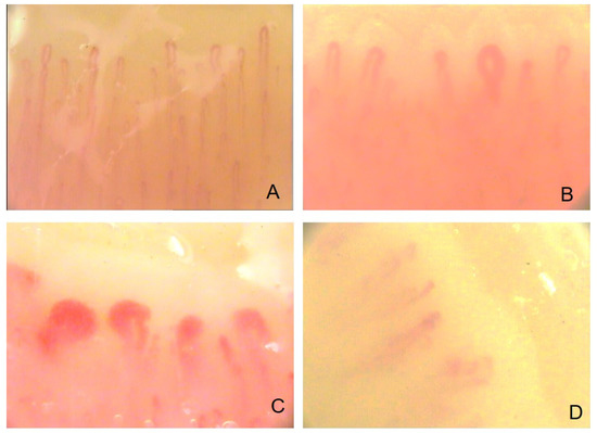 Nailfold videocapillaroscopy images (×200) in healthy subjects (A), “Early” (B), “Active” (C), and “Late” (D) patterns of scleroderma microangiopathy.