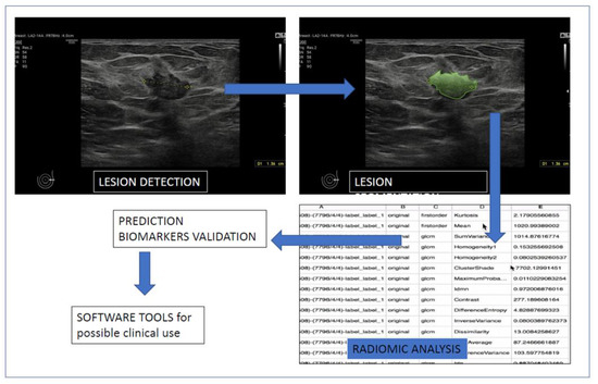 Breast cancer (BC) is the most common malignancy in women and the second leading cause of cancer death, so the early diagnosis of BC remains crucial [1]. Mammography is the first-line examination for breast cancer screening. In several settings, another fundamental tool is represented by breast ultrasound (US). In particular, US is recommended as a first-line examination in young women, during pregnancy or breastfeeding, and as an additional examination in women with dense breasts after mammography [2]. US presents several advantages, including safety, low cost, rapid execution, and cost-effectiveness. However, US remains an operator-dependent examination. For these reasons, in recent years, there has been a strong development of artificial intelligence (AI) in breast ultrasound. AI systems involve three working steps: image processing, segmentation, and feature extraction. AI is used to provide predictive models based on the analysis of the features extracted from radiological data. The first step is represented by lesion detection and segmentation (unsupervised or supervised). Then, radiomic analysis is performed with biomarker extraction and analysis used to obtain information for diagnosis or prognosis, as will be explained later. AI systems process a large amount of iconographic data from different imaging modalities to obtain output information [3]. In this framework, we can divide these into two main broad approaches: