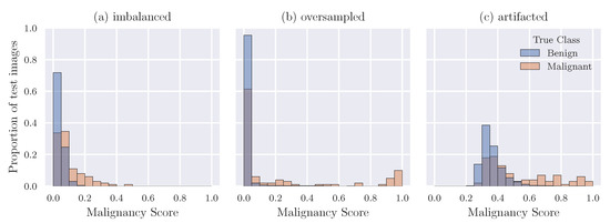 The Artifacted model yields a more natural distribution of predictions on the test set in that the range is more spread, allowing us to separate what might be considered high confidence from low confidence. However, two problems can be observed in Figure 2c. Firstly, a large proportion of truly malignant breasts still attain predicted malignancy scores similar to those assigned to benign samples, particularly in the range . Secondly, virtually zero samples are assigned a malignancy score less than . The exact reason for this behaviour is yet to be determined, but potential causes are discussed in Section 5.