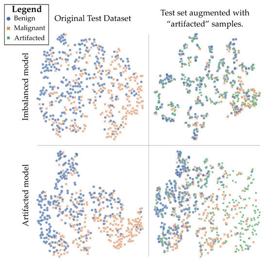 Examining in the latent space of models trained on . Shown is the output of t-SNE dimensionality reduction. Top row: imbalanced model; bottom row: “artifacted” model; left column: original test dataset, right column: test set augmented with “artifacted” samples.
