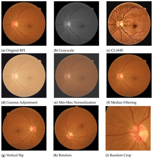 Within medical imaging, the RFI area is quite controlled and not so exposed to ambient noise, so they are usually inputs of high quality. However, fundus images are usually pre-processed to make more robust models and better predictions. Figure 4 shows examples of the main pre-processing operations used in the reviewed studies, having the original Figure 4a as a reference.