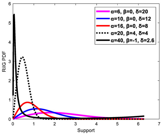 where α and β affect the distribution’s steepness and skewness respectively; β < 0 indicates a distribution that is skewed to the left, and β > 0 indicates one that is slanted to the right, whereas δ is the dispersion parameter. The value of can be calculated as . Figure 4 displays a selection of RiIG pdf realizations for different parameter values.