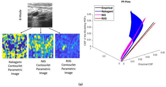 It is seen that, with an increase in α and β, the distribution becomes steeper and skews to the right, respectively. On the other hand, as β decreases, it skews to the left. In addition, as is increased, the distribution becomes more dispersed. The RiIG parameter (δ) map is created by processing the contourlet and curvelet coefficient images via a square sliding window, which results in the contourlet and curvelet parametric (CP) image. For the Nakagami image, parameter () mapping and NIG image as well as parameter () mapping are considered. This procedure is shown in [22], where the author constructed a Nakagami parametric image using this procedure while computing the image parameters for each image. It should be mentioned that while we created the images in the domains of the contourlet and curvelet transforms, the literature [22,39,40] obtained the parametric images in the spatial domain. According to earlier research, the best sliding window for producing sides that are the parametric image is a square and has a pulse duration that is three times that of the incident ultrasound. In this study, each local RiIG parameter (δ) was examined utilizing the contourlet and curvelet sub-band efficient images with a sliding window of 13 × 13 pixels. The size of the sliding window that is being used should be larger than the speckle and be able to discern different local structure differences in malignancies. The new pixel added to the window’s center at each point when the window was moved across the entirety of the contourlet and curvelet sub-band efficient pictures in steps of 1 pixel was designated as the local RiIG parameter (δ). The map of RiIG parameter values produced by this technique is known as the RiIG parametric image. With the relevant figures and a percentile probability plot (pp-plot), the RiIG statistical model is already proven to be preferable to the Nakagami statistical model [34]. In this study, the appropriateness of RiIG statistical modeling over the Nakagami and normal inverse Gaussian (NIG) statistical models is shown in Figure 5 by contourlet and curvelet parametric images and percentile probability plot (pp-plot).